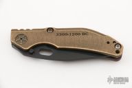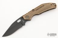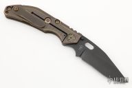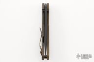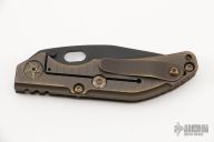 This DCG BBNM Framelock Folder has a black blade with dual thumbstuds and thumbhole. Handle has a brass and milled and anodized titanium frame with a tip up clip, and titanium barrel spacers. Centered blade and great lockup and detent with zero blade play. Excellent condition.