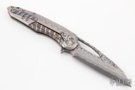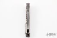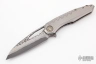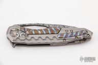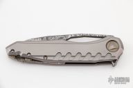 This Sigil is a collaboration by Deryk Munroe and Anthony Marfione and features a Hattori San-Mai Cowry-X Core blade, thumb hole and flipper, notched thumbrest. The blade is sterile. The handle is comprised of titanium scales with flamed titanium lockbar, backspacer and retractable titanium clip, Damascus overtravel stop, stainless lockface insert. Comes with original box and papers. Marked Anthony Marfione and Deryk Munroe and dated 05/2015. The box has a couple dings. There are some scuffs and light scratches on the knife: handle, blade, and clip. Otherwise great condition.