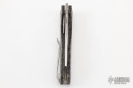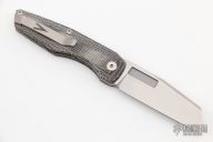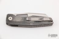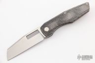 This Axon Mini Linerlock Folder by Vero Engineering features a hand rub satin finished blade with notched thumbrest and thumbhole. The handle has black canvas micarta scales with inlaid liner, tip up titanium clip with hidden screws, titanium backspacer. Rides on bearings, nice detent, lockup and blade seating. Comes with zippered case and COA #195. New condition.