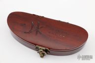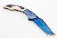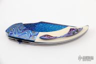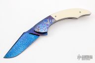 This knife by Damien Krause features a Dragon Skin Damascus blade with flipper. The handle has zircuti bolsters, walrus ivory scales with black liners, polished titanium liners, floating dragonskin Damascus backspacer, tip up mokuti clip.  Nice detent, lockup and blade seating.  Includes original wood display case.  Excellent Condition.