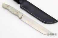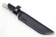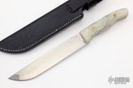 This Mini Leuku by Walk By Faith 777 features a hand rub satin finished blade with .127" blade stock and 1.250" blade depth, full tang construction. The handle has pearl resin scales with brass pins. Comes with a black leather sheath and original box. New from maker.