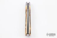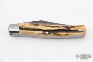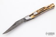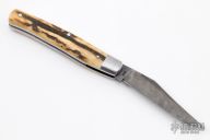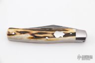 This Prototype Texas Jack by Rick Menefee features a color case hardened blade with nail nick. The handle has stainless steel bolsters, stag scales with a stainless steel escutcheon, stainless steel liners and spring. Has half-stop, flush in all positions. Centered blade, medium pull. New from maker! Marked "PROTO" on blade.