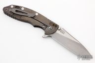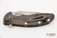 This Skinny XM-18 by Hinderer Knives features a two-tone drop point blade with notched thumbrest and flipper. The handle has a textured G-10 scale with anodized titanium liner and frame, tip up or down reversible titanium clip. Includes Hinderer titanium standoffs, bolts, screws, pivot and pocket clip. Nice detent, lockup and blade seating. Has a few scratches, otherwise excellent condition.