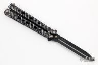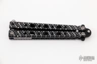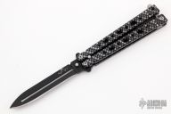 The Bear Song IV butterfly knife by Bear OPS is a lightweight flipper that is designed to be your go-to everyday carry knife. This B-500 model features aluminum handles with carbon fiber graphic overlays, stainless steel spacers and a swappable latch. The pivots have 304 bearing surfaces and phosphorus bronze washers. The black finished stainless spear point blade has a double tang pin design for great performance. Excellent condition. 14c28n blade steel.