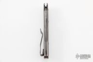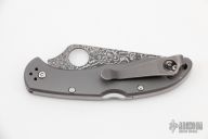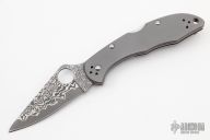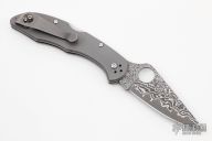 This Delica Lockback Folder from Spyderco has a San Mai Damascus VG-10 core blade with thumbhole and notched thumb ramp. Handle is a titanium frame, stainless steel lock/ spacer, tip up deep carry titanium pocket clip. Has scuffs on the handle, otherwise good condition.