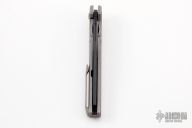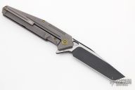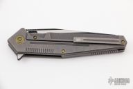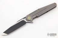 This framelock flipper by WE Knife features a two-tone tanto blade with notched thumbrest and flipper. The handle has a milled and tumbled titanium frame with anodized hardware. Rides on bearings, nice detent, lockup and blade seating. Excellent condition.