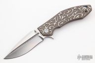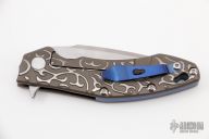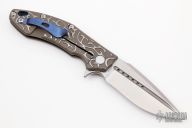 The intricate engraving on the handle of this Sovereign Tang flipper is inspired by the "Living Meadow" motif of the Tang Dynasty, lending an artistic flavor to the overall tactical design. It features a 3.56" CPM-S35VN blade with a drop point shape, fuller, and finger choil. The action is quick, snappy and authoritative, as with all Kizer knives. There is a large lanyard slot that will easily house 550 paracord. The CNC laser carved titanium handle has an extremely ergonomic shape to it and a nice thumb ramp on the blade. It has among the smoothest actions of any knife in the building and the drop point S35VN blade is as beautiful as it is practical. An excellent design and superb quality folder from Kizer.