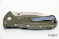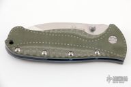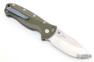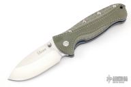 This knife by Kizer features a satin finished blade with dual thumbstuds. The handle has a green G-10 scales, bead blasted and anodized titanium liners with a tip up anodized titanium clip, black G-10 backspacer and lanyard hole. Comes with original box and papers. Excellent condition.