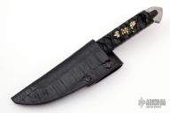 This knife by ITAC features a clip point blade with false top edge and notched thumbrest, .249" blade stock and 1.268" blade depth, full tang construction with leather wrapped handle over leather and nickel silver menukis. Comes with a leather covered kydex sheath and zippered case. Has some light spotting on the blade, otherwise excellent condition.