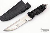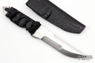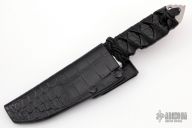 This knife by ITAC features a hand rub satin finished blade with false top edge and notched thumbrest, has hamon, .192" blade stock and 1.224" blade depth, full tang construction with leather wrapped handle over leather. Comes with a leather covered kydex sheath and zippered case. Has some light scratches on the blade, otherwise excellent condition.