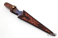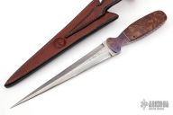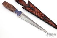This Dagger by PJ Ernest features a Damascus double edged blade, .243" blade stock and 1.429" blade depth, full tang construction. The handle has blued Damascus bolsters, burl wood scales with black/nickel silver spacers. The tang is fileworked. Comes with a hand tooled brown leather sheath by TreeStump leather, and a zippered case. Has some oxidation, otherwise good condition.
