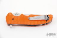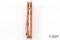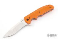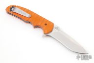 This knife features a milled primary bevel and satin finished flats and a notched thumbramp.  The handle features sculpted G10 scales over stainless liners and a tip up pocket clip.  Light scratches are visible on the blade otherwise the knife is in excellent condition.