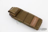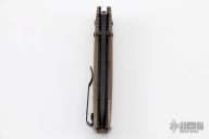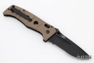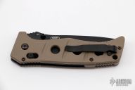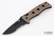 This Adamas by Benchmade is a Shane Sibert design, it has a black partially serrated blade with dual thumbstuds, fullers and notched thumbrest. The handle has FDE G-10 scales, black stainless steel liners and tip up clip. Nice lockup and blade seating. Comes with original sheath. Excellent condition.