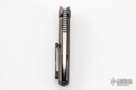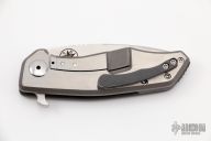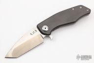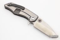 This Gladius by Robert Oldaker features a satin finish tanto blade with notched thumbrest and flipper. The handle has a Zirconium front scale, backspacer and tip up clip, satin finished titanium lockside. Nice detent, lockup and blade seating. Has a nick in the clip, otherwise excellent condition.