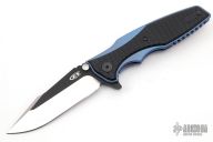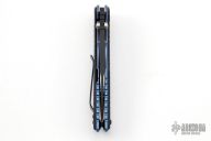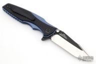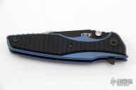ZT's 0393 pairs an aggressive Rick Hinderer design with a solid Zero Tolerance build to create a substantial EDC folding knife. The 0393 sports a Hinderer Maximus inspired handle with a blue anodized titanium frame, carbon fiber overlays, comes with a set of black G-10 overlays as well. Its Spanto style blade is made from CPM-20CV steel in a two-tone finish with satin grinds and DLC flats. This knife is compatible with a selection of Hinderer custom hardware to make your knife stand out from the crowd. Features: KVT ball-bearing pivot for smooth and easy one-handed opening. Reversible pocket clip for secure left or right tip-up carry. 20CV Spanto blade provides excellent edge retention, superior hardness, and piercing power. Comes with original box and papers. #1076. Has a couple light scratches on the blade, otherwise excellent condition.