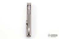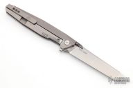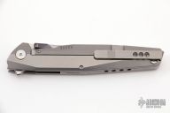 This 1507T flipper by Rike Knife features a bead blasted tanto M390 blade with dual anodized titanium thumbstuds and a notched flipper, has a dimpled thumbrest. The handle has a milled titanium frame with matching backspacer and tip up clip, stainless lockface insert. Rides on bearings, nice detent, lockup and blade seating. Comes with original zippered case. Has a few light scratches, otherwise excellent condition.