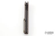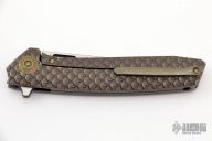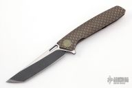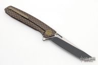 This 604A by WE Knives has a two tone, tanto style blade with black coated grinds and satin flats. The blade features a thumb hole, notched thumbrest and flipper. The handle is comprised of a black "Scale" machined titanium frame with anodized titanium tip up clip. Purple anodized hardware. Great blade seating, detent and lock up. Includes padded and zippered case, disassembly tool. Has some light scuffs and scratches, otherwise excellent condition.