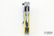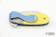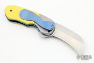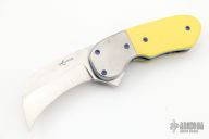 This Bug flipper from J.E. Rooda has a satin finished hawkbill blade with a notched thumbrest and flipper. The handle has orange peel finished and dovetailed titanium bolsters, yellow G-10 scales, anodized titanium liners and titanium pocket clip, tip down carry. Nice detent, lockup and great blade seating. Comes with makers card and hard case. Brand new from maker.