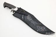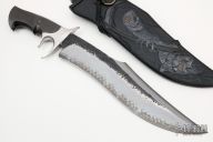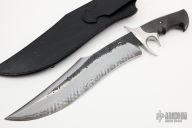 This 20" Sub-Hilt Fighter by Claudio Sobral features a forged San Mai Damascus blade (420/1095 steel) with hammer marked flats and false top edge, .299" blade stock and 2.901" blade depth, hidden tang construction. The handle has a stainless steel guard and sub-hilt, nicely figured carbon fiber grip. Comes with a beautiful hand tooled black leather sheath and a  zippered case. Excellent condition.
