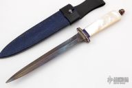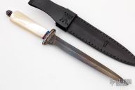This Dagger by Todd Kopp features a Damascus double-edged blade with .199" blade stock and .839" blade depth, hidden tang construction. The handle has blued steel guard, butt and collar with fileworked nickel silver spacers, the grip is one piece of mother of pearl. Has a couple of hair line cracks in the pearl, but honestly they look naturally occuring, this is the thickest piece of pearl I have seen. Comes with a black leather sheath with blue ostrich skin overlay. Comes with a zippered case. New from maker.