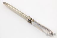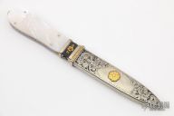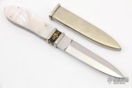 This Mini California Dagger by D.E Friedly features a hand rub satin finished double edged blade with .189" blade stock and .772" blade depth, hidden/frame tang construction. The handle has an engraved and gold inlaid stainless steel guard and frame, engraved by Gil Rudolph, mother of pearl scales with nickel silver pins. Comes with an engraved and gold inlaid nickel silver scabbard with a diamond set in the gold flower on the front. Comes with a zippered case. Excellent condition.