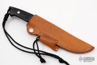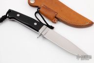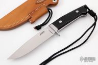 This Large Clip Point Utility by John Young features a mirror polished blade with notched thumbrest, .238" blade stock and 1.278" blade depth, full tapered tang construction. The handle has a mirror polished stainless guard, black G-10 scales and red liners. Lanyard hole at butt. Comes with brown leather sheath and nylon zippered case. Excellent condition. "JFJ" on spine of blade.