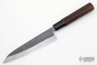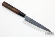 The Petite 150 from Shinichi Watanabe features a stainless clad steel blade with a hidden tang construction. .116" Blade Stock. 1.407" Blade Depth. The handle features buffalo horn hilt nicely complemented by a burn chestnut wood grip.  Yasuki blue steel core with stainless outer. This is a fantastic piece that is razor sharp. New from Maker.