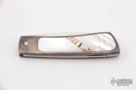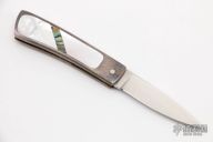 This Interframe Lockback by Chuck Stewart features a satin finished drop point blade with nail nick. The handle has a silver frame with mother of pearl and abalone inlays over a steel lockbar and backspacer. Handling marks and patina on frame and very fine scratches on blade. Includes leather zippered case.