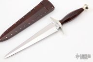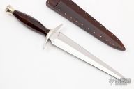 This Dagger by the late Joe Kious features a mirror polished double edged blade with .126" blade stock and 1.112" blade depth, hidden tang construction. The handle has a nickel silver guard and butt with filework and an octagonal cocobolo grip. Comes with a matching wooden scabbard. Comes with a zippered case. Excellent condition.