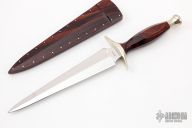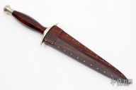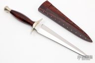 This Dagger by the late Joe Kious features a mirror polished double edged blade with .122" blade stock and 1.089" blade depth, hidden tang construction. The handle has a nickel silver guard and butt with filework and an octagonal cocobolo grip. Comes with a matching wooden scabbard. Comes with a zippered case. Excellent condition.