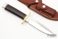 This Combat Companion by Randall Made Knives features a polished blade with .235" blade stock and 1.072" blade depth, 3" sharpened top edge, hidden tang construction. The handle is comprised of a brass double guard, red/white/blue spacers, stacked leather grip, duralumin butt. Includes a brown leather sheath and a zippered case. Has some light scratches and a small pitted spot on the Picasso, otherwise excellent condition.