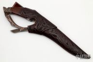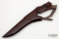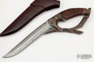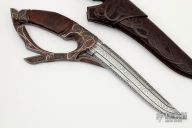 This D-Guard Fighter by Andre Andersson features a 5-Bar Damascus blade with a false top edge, .157" blade stock and 1.330" blade depth, hidden tang construction. The handle has a blued steel guard and butt, Damascus D-Guard, fluted desert ironwood burl grip. The guard/butt/d-guard have been masterfully engraved and inlaid with gold, copper and silver. Comes with a beautifully hand tooled brown leather sheath with wood core. Comes with a zippered case. Dated 2021 on the guard. New from maker.