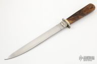 This knife by Journeyman Smith Geoff Keyes features a hand rub satin finished blade with .182" blade stock and 1.073" blade depth, hidden tang construction. The handle has a carved and fluted nickel silver habiki and wood grip. Comes with a zippered case. has a few light scratches, otherwise excellent condition.