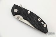 This 3" Slicer XM-18 Gen4 flipper from Hinderer Knives has a two-tone stonewashed blade with notched thumbrest and flipper, no choil. Black G-10 scale and a stonewashed titanium frame and custom horse head pocket clip. Reversible pocket clip. Strong lock up, nice detent and blade seating is center. Includes original box, extra bushings and papers. Has some light scratches on the blade and hardware, otherwise excellent condition.