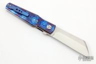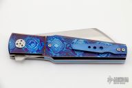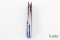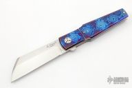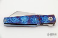 This linerlock flipper by Sergio Consoli features a hand rub satin finished blade with notched flipper. The handle has Timascus scales, Inox steel liners, and an anodized titanium backspacer and tip up clip. Sergio's ball bearing system gives the knife an effortless flip that requires no wrist action. Nice lockup, detent and blade seating. Outstanding work. Excellent condition. Comes with zippered case and COA dated September 2018.