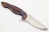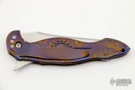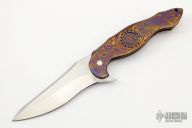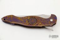 This Custom Shark Flipper by Jim Smyth features a hand rubbed satin finished blade with notched thumbrest and flipper. The handle has a timascus frame with a tip down titanium clip, notched and anodized titanium backspacer, lanyard hole at the butt. Nice detent, lockup and blade seating. Excellent condition. Comes with zippered case.
