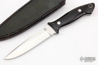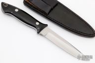 This Stalker by Bob Lum features a hand-rubbed satin finish blade with a false top edge, and a black linen micarta scales, .162" blade thickness and 1" blade depth, full tapered tang. Excellent fit and finish. Outstanding work. Includes a black leather sheath with belt loops. Excellent condition. These are impossible to find. Don't miss out on this one.
