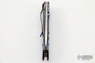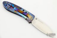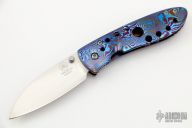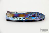 This Framelock by Tom Mayo features a hand rub satin finished blade with a single thumbstud. The handle has a Timascus frame with an anodized titanium tip down clip. Smooth action. Nice detent, blade seating and lockup. Excellent condition.
