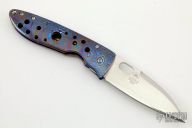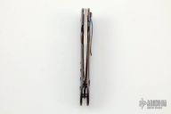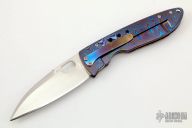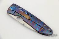 This Lefty Framelock by Tom Mayo features a hand rub satin finished blade with thumbhole. The handle has a Timascus frame and tip down anodized titanium clip. Smooth action. Nice detent, blade seating and lockup. Excellent condition.