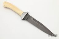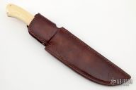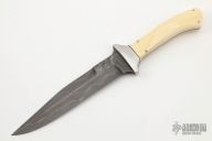 This Fighter by Jim Lee features a Damascus blade with sharpened top edge, .193" blade stock and 1.262" blade depth, full tapered tang construction. The handle has stainless steel dovetailed bolsters and mammoth ivory scales with stainless steel pins. Comes with a brown leather sheath and a padded zippered case. Light patin is visible on the blade and tang.  Has a couple light scratches, otherwise good condition.