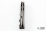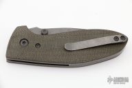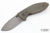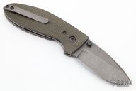 This Alpha by Tom Krein features an acid finished drop point blade with dual thumbstuds and a false top edge. The handle has green canvas micarta scales, tumbled titanium liners and tip up clip, titanium backspacer. Nice lock up, detent and blade seating. Included a padded case. New from Maker!