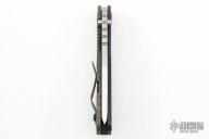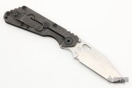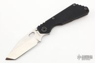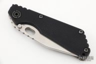 This Strider SNG framelock folder features a stonewashed blade with thumbhole and notched thumbrest. The handle has a black G-10 and stonewashed and flame anodized titanium frame with titanium clip, tip up carry. Jimping on blade spine. Nice lockup, detent, and blade seating. Has scuffs, scratches, and appears resharpened. Good condition otherwise.