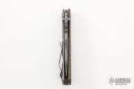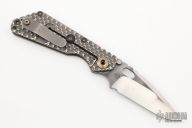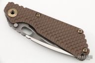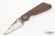 This Strider SNG framelock folder features a stonewashed blade with thumbhole and notched thumbrest. The handle has a brown G-10 and stonewashed and anodized titanium frame with titanium clip, tip up carry. Jimping on blade spine. Nice lockup, detent, and blade seating. Has scuffs, scratches, appears reground and resharpened. Good condition otherwise.