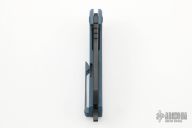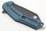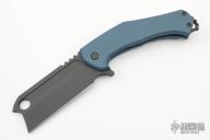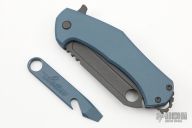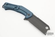 This Orphan by Eric Luther features a Cobalt Cerakote coated blade with satin flats, milled fullers, hole in blade, notched thumbrest, flipper. The handle has a Blue Cerakote, cobalt finished titanium backspacer with lanyard hole, blue coated tip up titanium clip. Comes with zipper case and COA dated 03/16/0222. Nice detent, lockup and blade seating. New from maker at Blade Show Texas 2022.