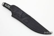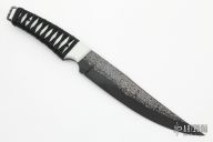 This knife by Erik McCright features a parkerized San Mai Damascus blade (80CRV2 and Pure Nickle), .189" blade stock and 1.243" blade depth, full tapered tang construction. The handle has black Ito wrap over white G-10 scales. Comes with a hand tooled black leather sheath and a zippered case. New from maker at the 2022 Blade Show Texas. Comes with a COA dated 3/7/22.