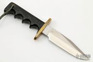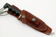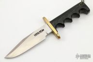 This is a miniature version of Randall's Model 14 Attack. The Model 14 was designed to meet the demand for an almost indestructible all-purpose knife, though it is especially suited for combat and survival purposes. #555. Satin finished blade with sharpened top edge, .177" blade stock and .848" blade depth, full tang construction. The handle has a brass guard and black linen micarta grip, lanyard hole at the butt. Knife is in excellent condition. Comes with original brown leather sheath.