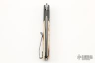 This Urban Barlow Front Flipper by Brad Zinker features a Damasteel blade with checkered thumbrest, thumbhole and front flipper. The handle has dovetailed Zirconium bolsters, mammoth ivory scales, anodized titanium liners with laser engraved interiors and a tip up anodized titanium clip. Rides on bearings, nice detent, lockup and blade seating. Comes with zippered case. New from maker!