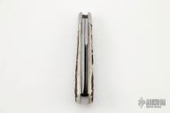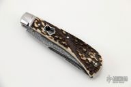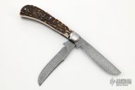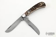 This Two-Blade Trapper by Chris Sharp features his Patent Pending see-through escutcheon. The handle has 416ss fluted bolsters with integral liners and escutcheons, stag covers, filework on liners, stainless steel springs. Has half-stop, flush in all positions. Comes with zippered case.  New from maker!