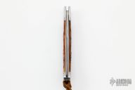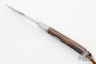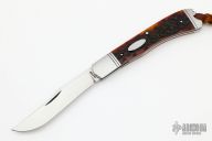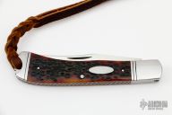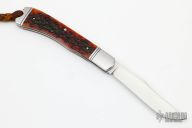 This Single Blade Trapper by Phil Jacob features a hand rub satin finished blade with nail nick. The handle has threaded stainless steel bolsters, jigged bone covers, stainless steel liners and spring with Roman Knot filework.  Has half-stop, flush in all positions. Comes with zippered case.  New from Maker!