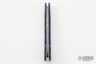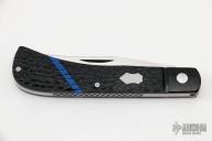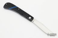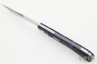 This Trapper by Phil Jacob features a hand rub satin finished blade with nail nick. The handle has black paper micarta covers over blue G10 liners, stainless steel spring.  The back spring and liners feature Roman-knot filework. Has half-stop, flush in all positions. Comes with a zippered case.  New from maker!